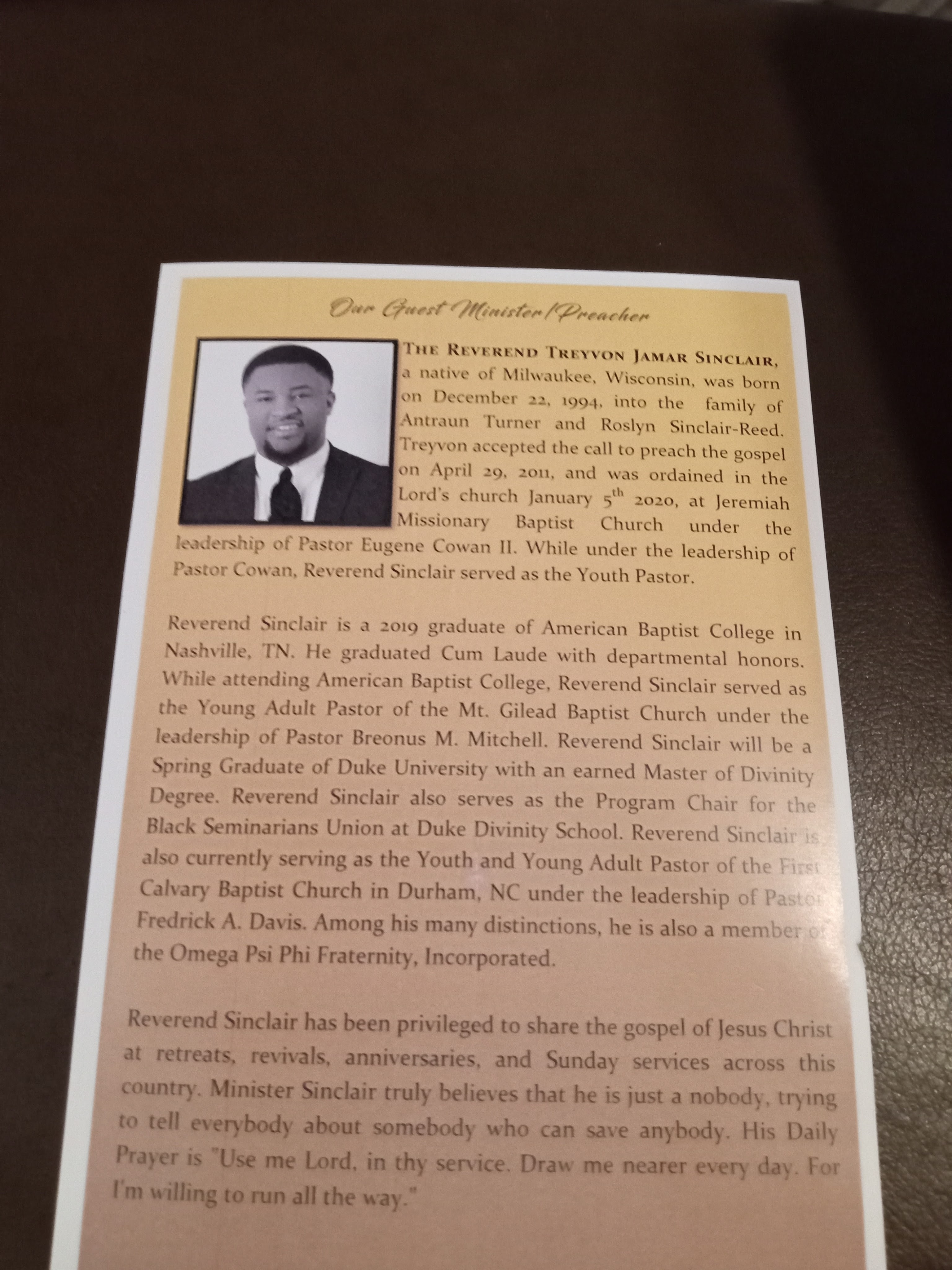 Special thanks to Pastor John Wesley McVicker, Sr., for asking Reverend Treyvon Jamar Sinclair to be our guest speaker for today’s Annual Menś Day.