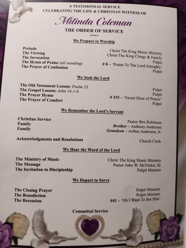 After hearing the testimonies, Pastor John Wesley McVicker, Sr., alluded to the bereaved congregation that Milinda Coleman enriched the family with the Word of God and His teachings. He said he did not know her, but the Message would come vicariously through the life of her son, Deacon Lonnie Anderson, and his wife, Phyllis Anderson, faithful and committed members of CTK.