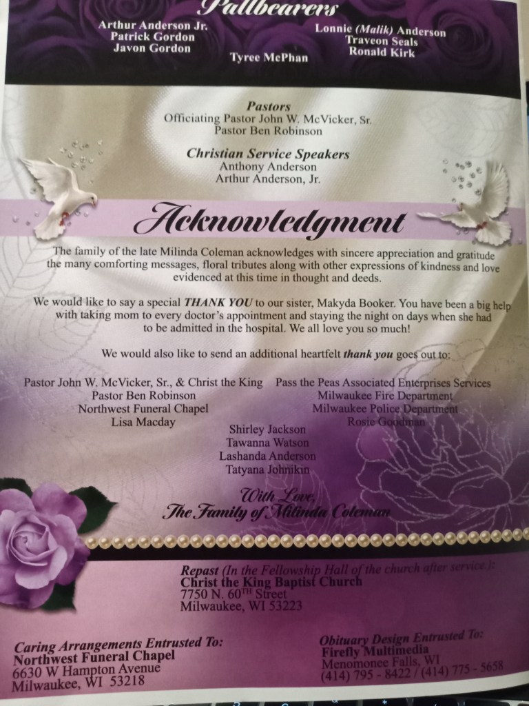 Like her son, Lonnie, Milinda was familiar with hard work. Bereaved Resolutions from Pastor John Wesley McVicker, Sr.; Milwaukee Public Schools, Superintendent Keith Posley submitted an answer on behalf of Milwaukee Public Schools, and the church clerk acknowledged more. The late Milinda Coleman received her formal education from Milwaukee Public Schools, modeled for commercials, and worked for the Yellow Cabs service. The Obituary stated, “In 1985, she was an independent cab service operator with Louis Coleman for both Milwaukee Brew City and Yellow Cab.” In her leisure time, she fellowshipped with her grandchildren, garden, praise dance, went for walks at the lake, wrote music, and prayed daily with her prayer partner.