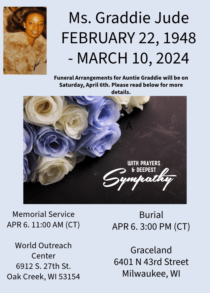 She was born to the late Willie Mae Jude. Both parents, with the same name, are deceased. Graddie Jude is an Aunt to many: a well-known Milwaukee barber, a Friend, a Great-Grandmother, a Mother, and a Sister to 15; one died at birth. Her time is near, so please keep her and the Jude Family in your prayers to Jesus Christ. Advent Saturday, March 9th