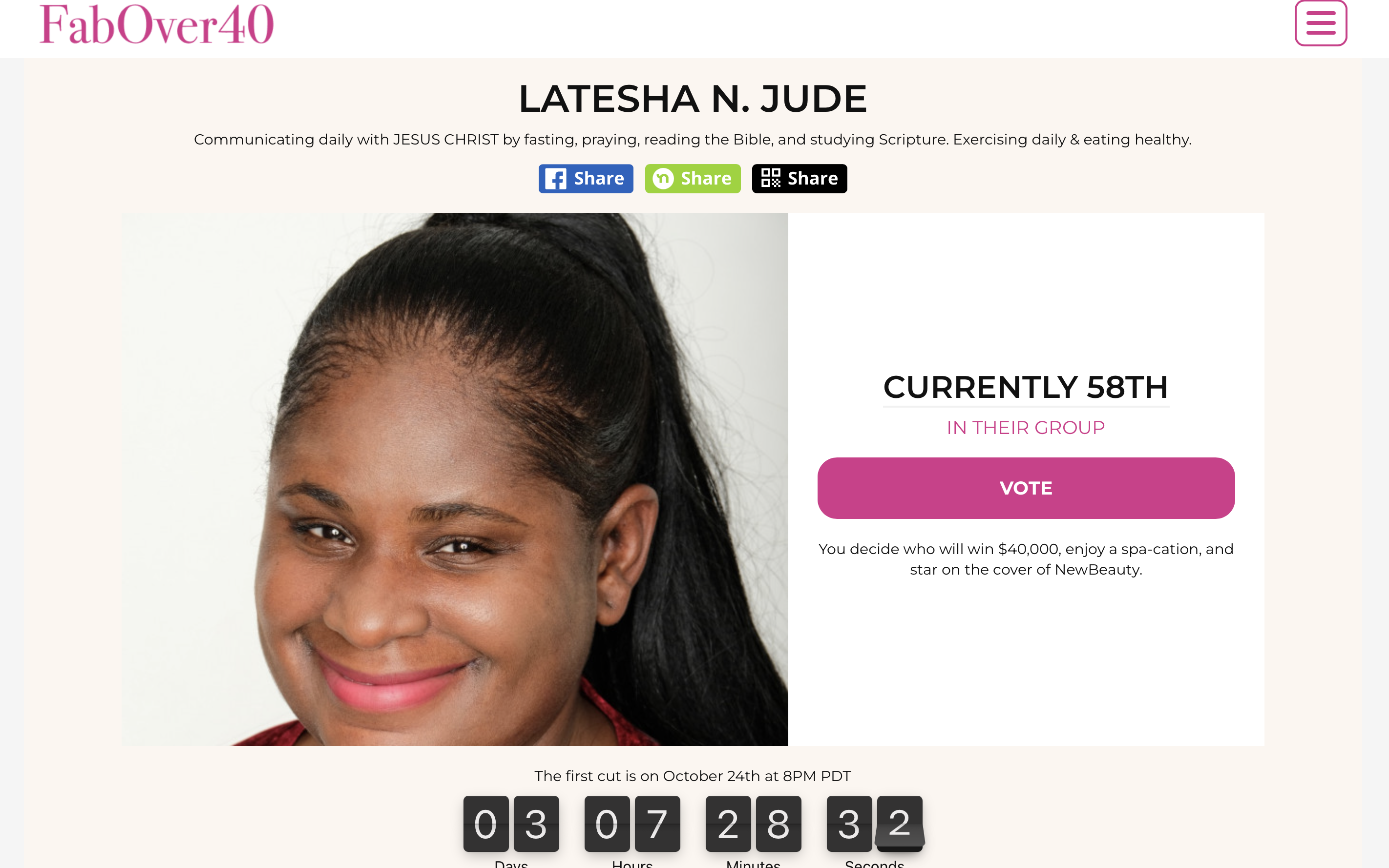 Ms. Latesha N. Jude is running for FabOver40. Now, I need your vote!