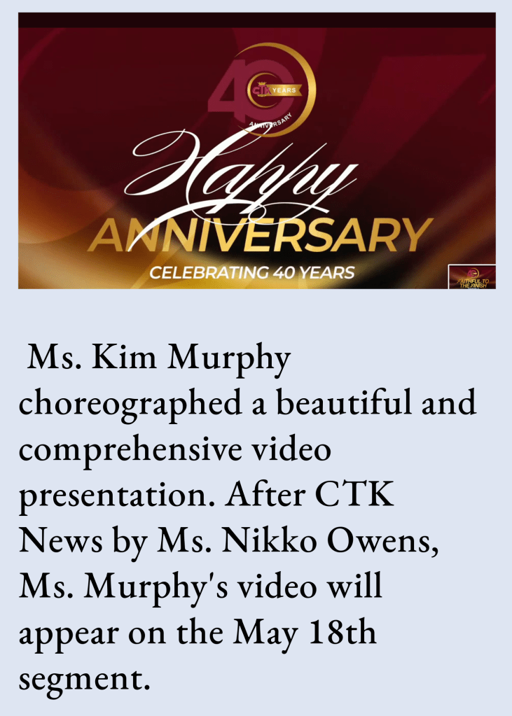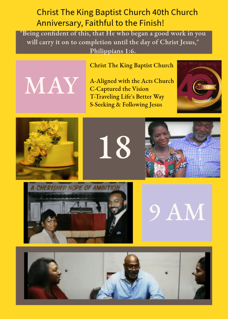 On Sunday, May 18th, 2025, Founders Pastor John Wesley McVicker, Sr., and First Lady Marilynn McVicker celebrated with Executive Pastor Treyvon Sinclair, members of the pulpit, CTK’s parishioners, and guest speaker of the hour, Rev. Dr. Don Darius Butler accompanied by his wife Attorney Butler all reminiscing collectively of how Pastor John Wesley McVicker, Sr, First Lady Marilynn McVicker, and CTK labored in love for 40 consecutive years at home and overseas. The Theme stemmed from the acronym ACTS.