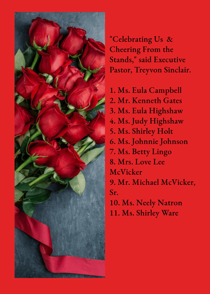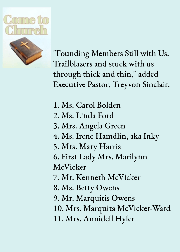 “You know their names, and they sat right next to you. They were your prayer partners. They volunteered in the work of ministry alongside you and today, they are leaning over the battlements of glory, telling you to run on to see what the end will be. (Rev) Brenda Sheets, (Deacon) Marvin Bell, and Deacon Croft, Michael McVicker. Call their names. You know them, and today, we thank God for what the hymn writer says that we share with them a Mystic Communion.”