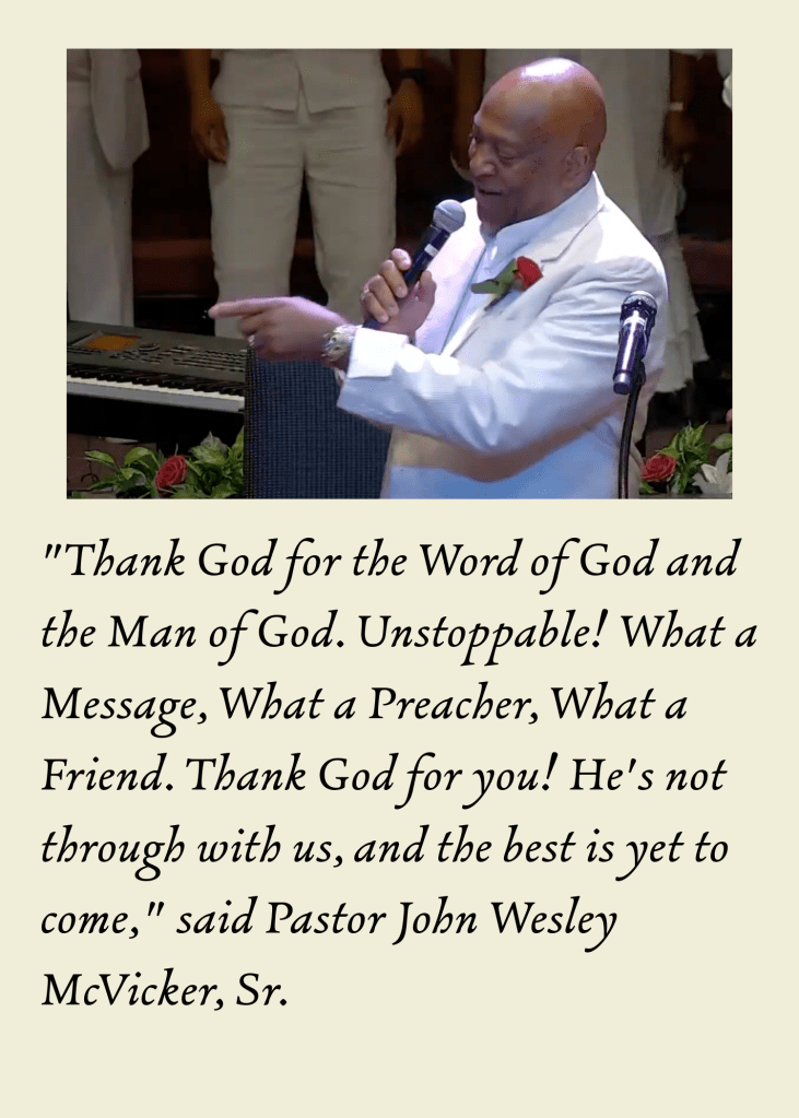 “But thanks to God for His keeping power. God’s preservation of this congregation that stands not just in this city but across this country stands as an Exemplar of Innovation and Vibrancy in Christian Ministry, and that would not be possible except God gave you through the personality of a man who stands a cut above the rest. One whose spirit is both capacious and magnanimous. Whose heart has been devoted solely to the work of our God and of his Christ and whose hands have advanced that commitment through the work that we now behold. I’m talking about the inimitable and the indomitable John Wesley McVicker, Sr. God be praised for him. God Be Praise! Yes, Lord!”